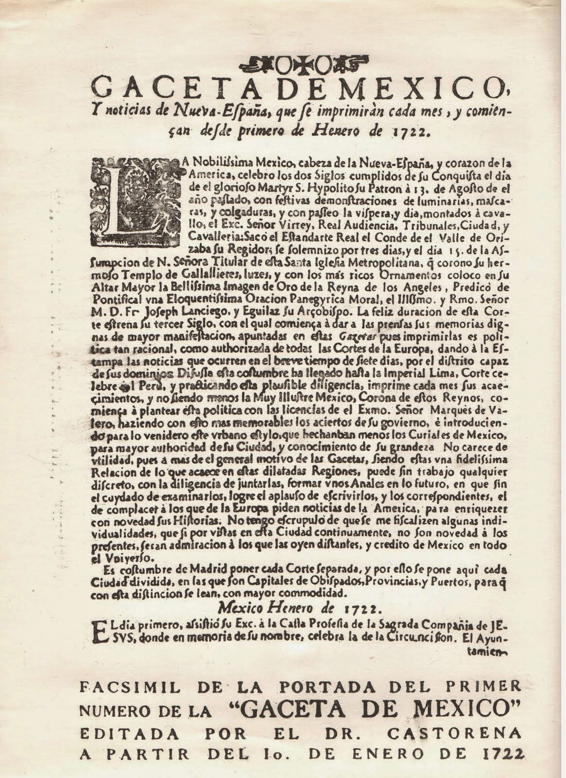La primera gaceta en nuestro país fue: «Gaceta de México y noticias de la Nueva España» por Juan Ignacio Castorena y Ursúa.